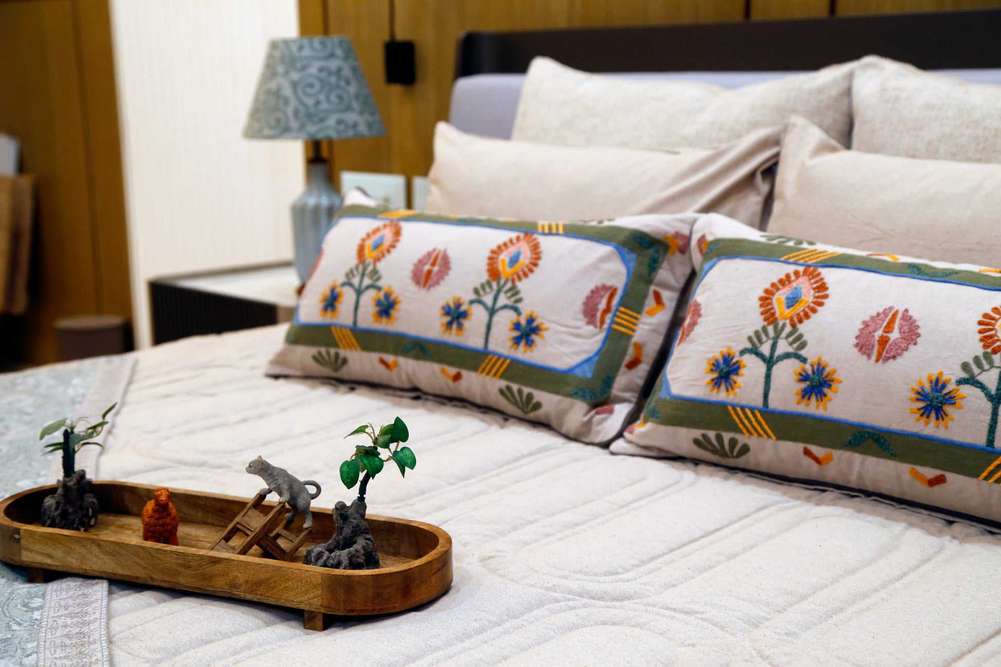 A soft quilted bedcover designed with a subtle stitched pattern for timeless elegance. Paired with embroidered cushions, it creates a refined and inviting bedroom setting