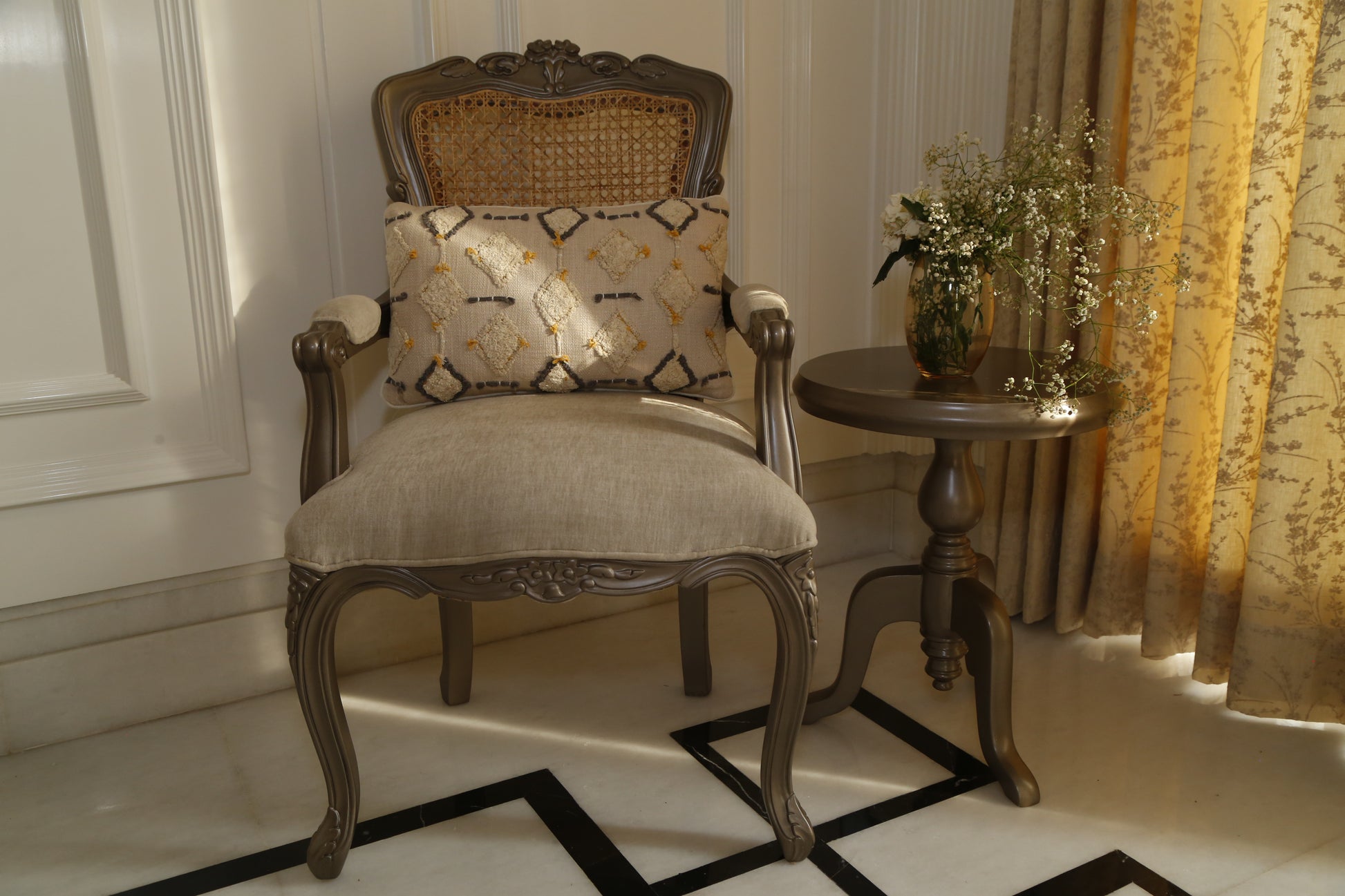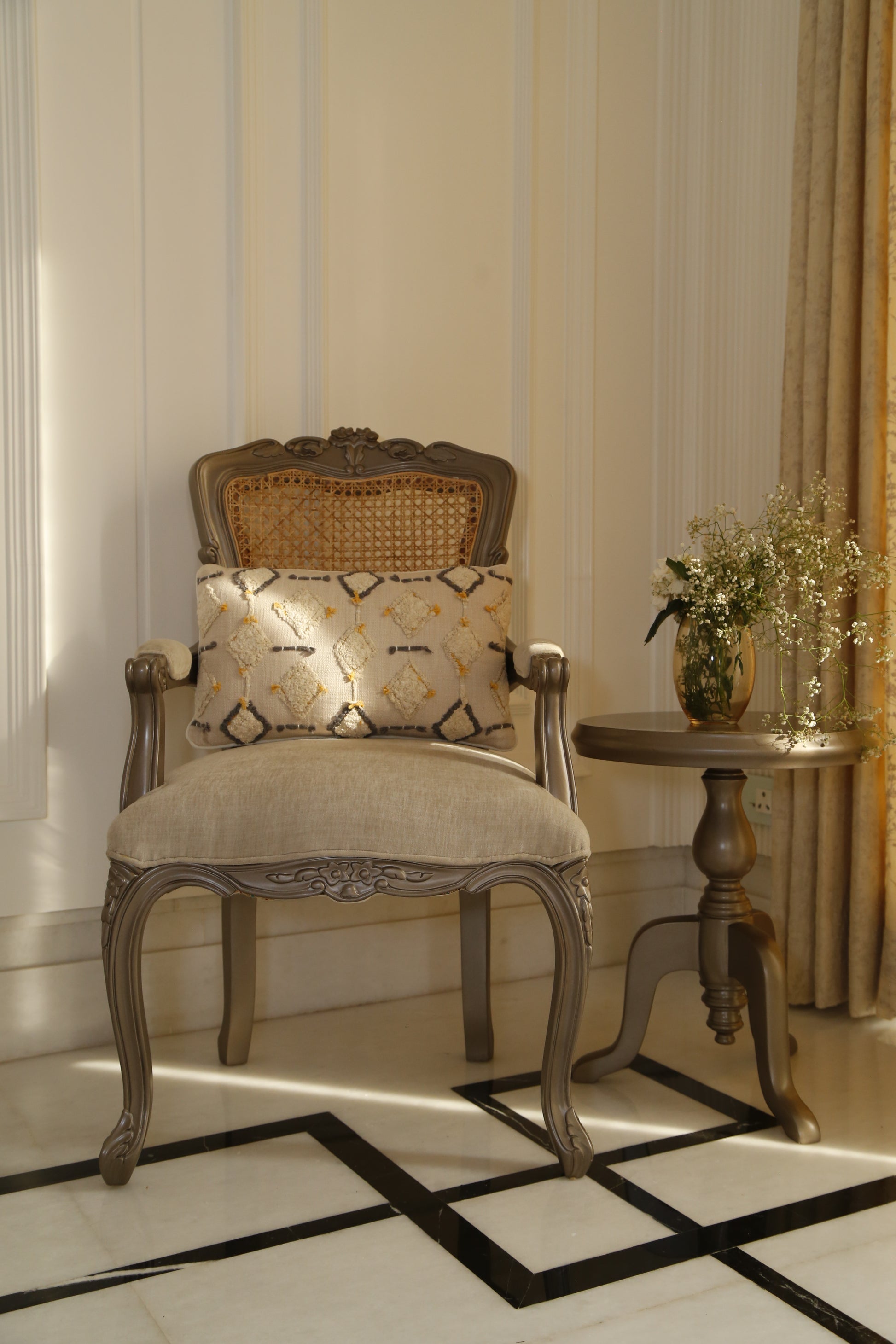 Intricate embroidery, both hand and machine, On a white cushion, so pure and serene, Tassels adding a touch of playfulness, This pillow is a perfect blend of elegance and happiness.