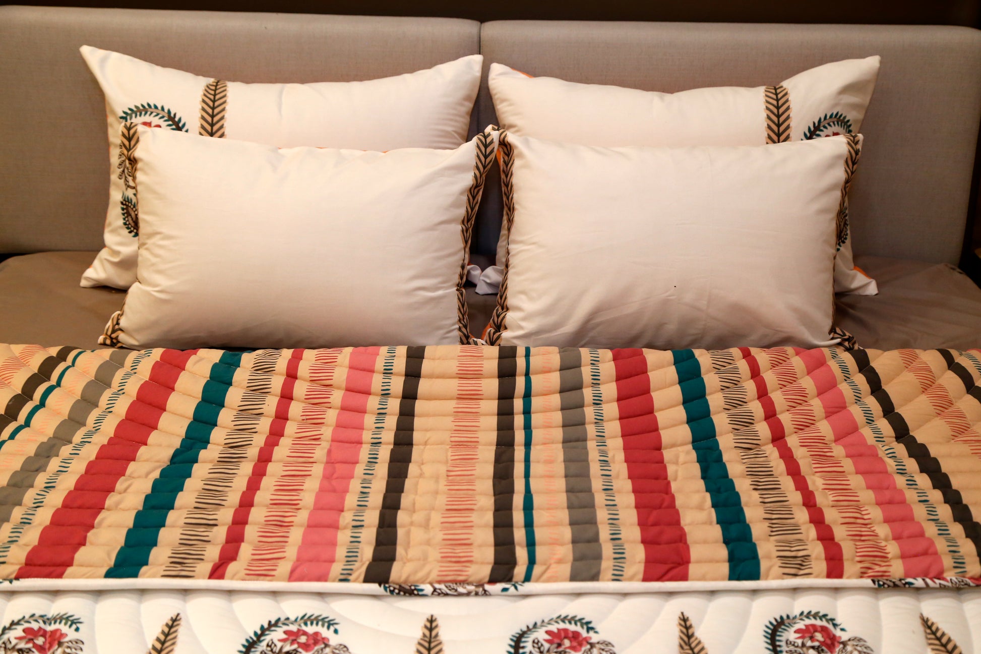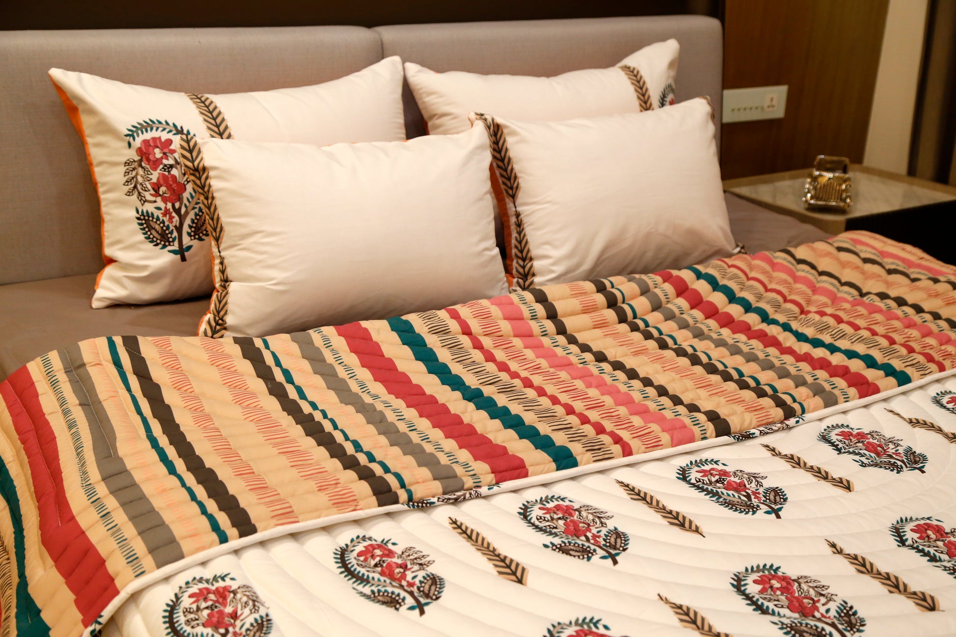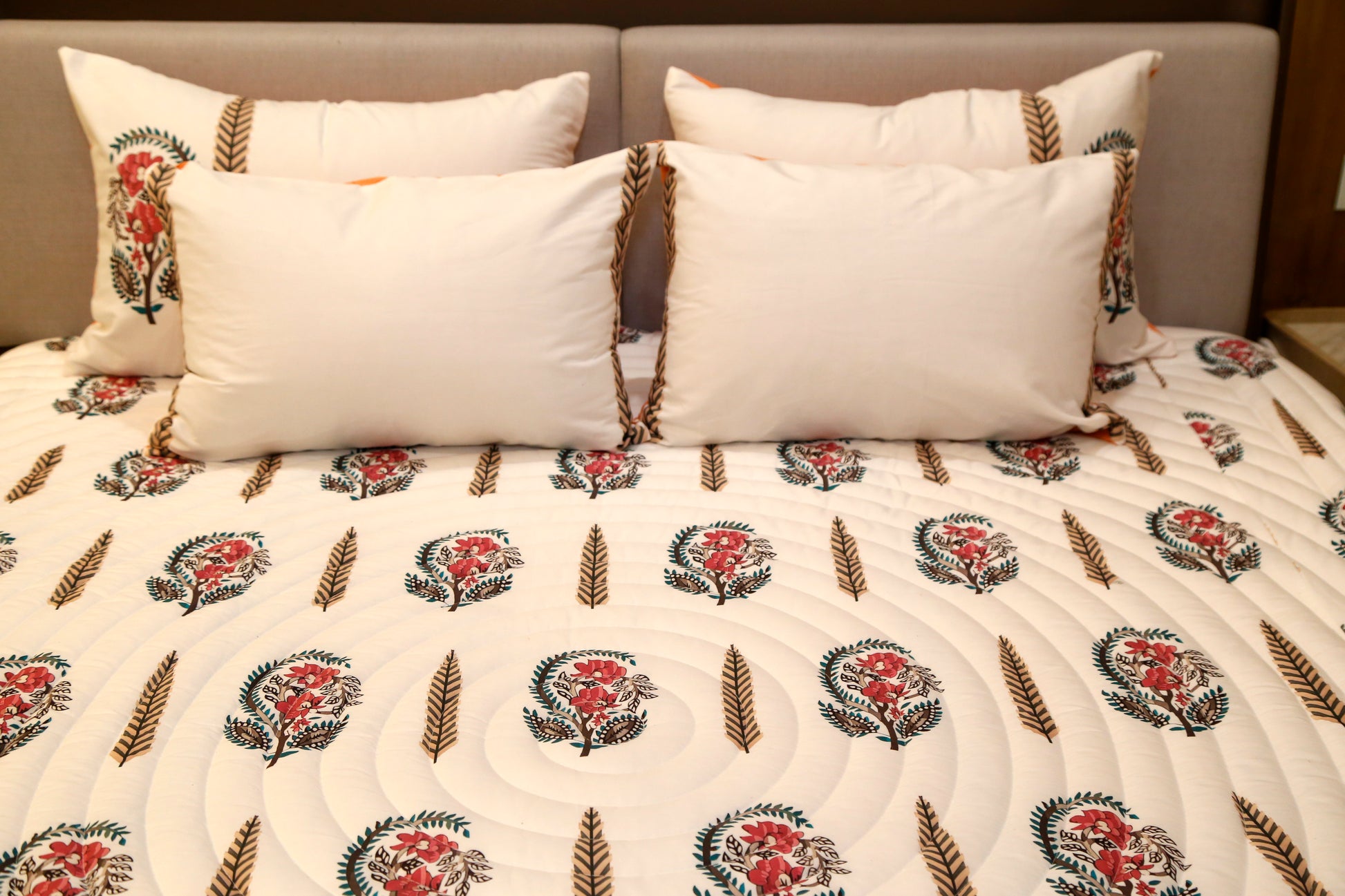 This beautiful light bedsheet with printed quilted bed sheet with print pillow cover is made from soft, high-quality Material and features intricate print of delicate Nature. The print adds a touch of elegance and sophistication to the overall design of the bedsheet, while the material ensures that it is both comfortable and durable. Perfect for adding a touch of beauty and style to your bedroom decor.