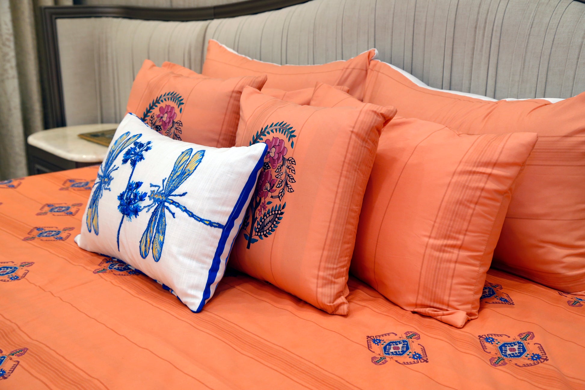 This beautiful light bedsheet with printed bed sheet with print pillow with embroidery cover is made from soft, high-quality Material and features intricate pattern print of delicate Nature. The print adds a touch of elegance and sophistication to the overall design of the bedsheet, while the material ensures that it is both comfortable and durable. Perfect for adding a touch of beauty and style to your bedroom decor.
