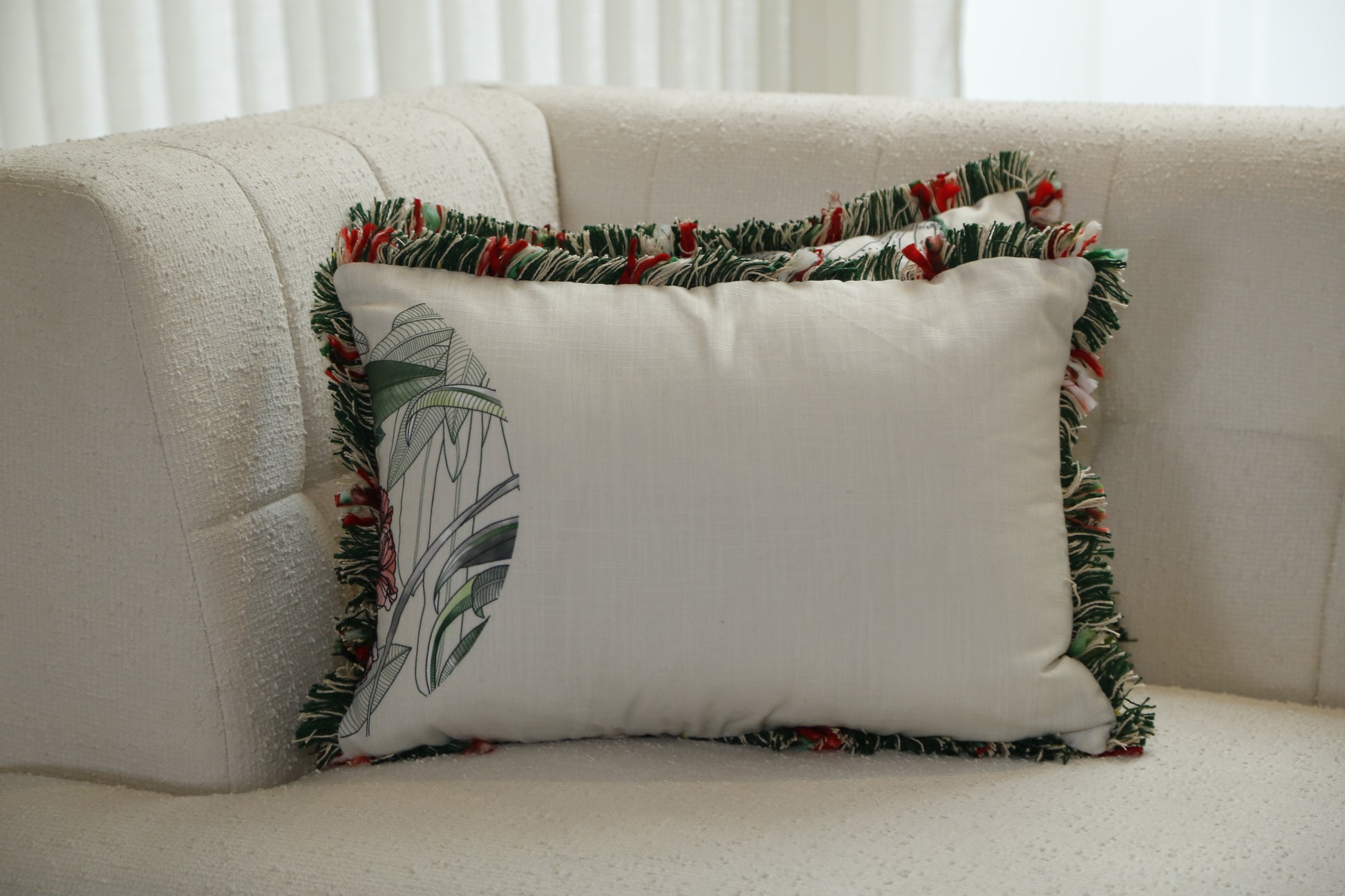 A printed cushion, with side printed of cushion so it's looking so happiness with fringe, Bringing the feel of new life with colourful, so divine, With leafs , so colourful and bright, This pillow is a symbol of Spring, a stunning sight