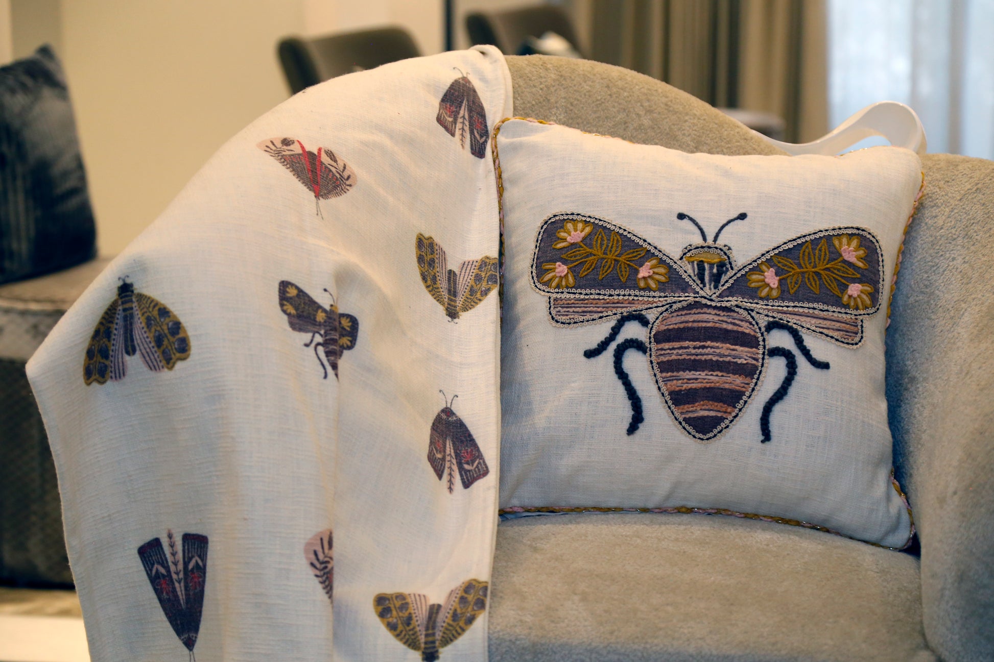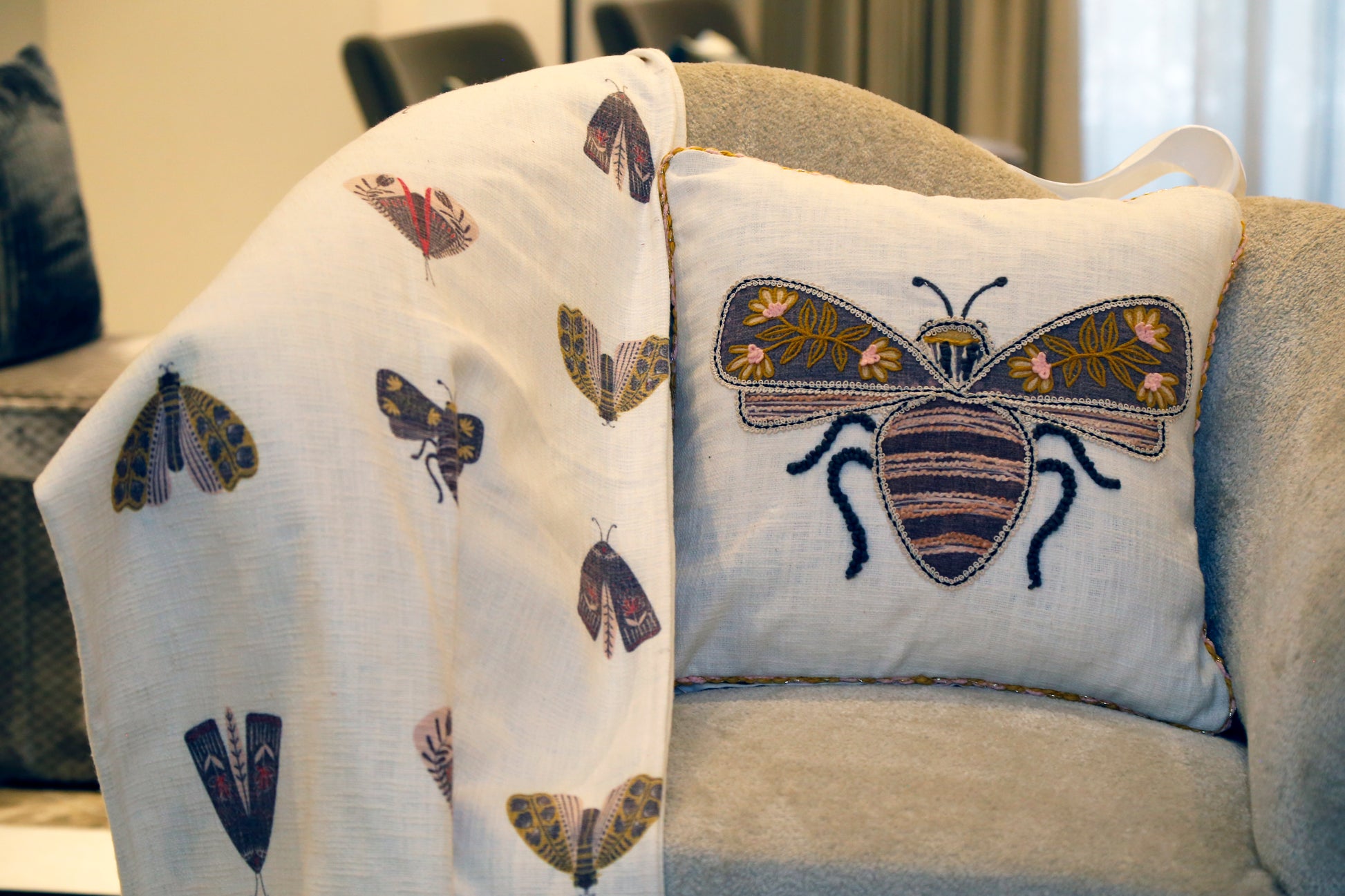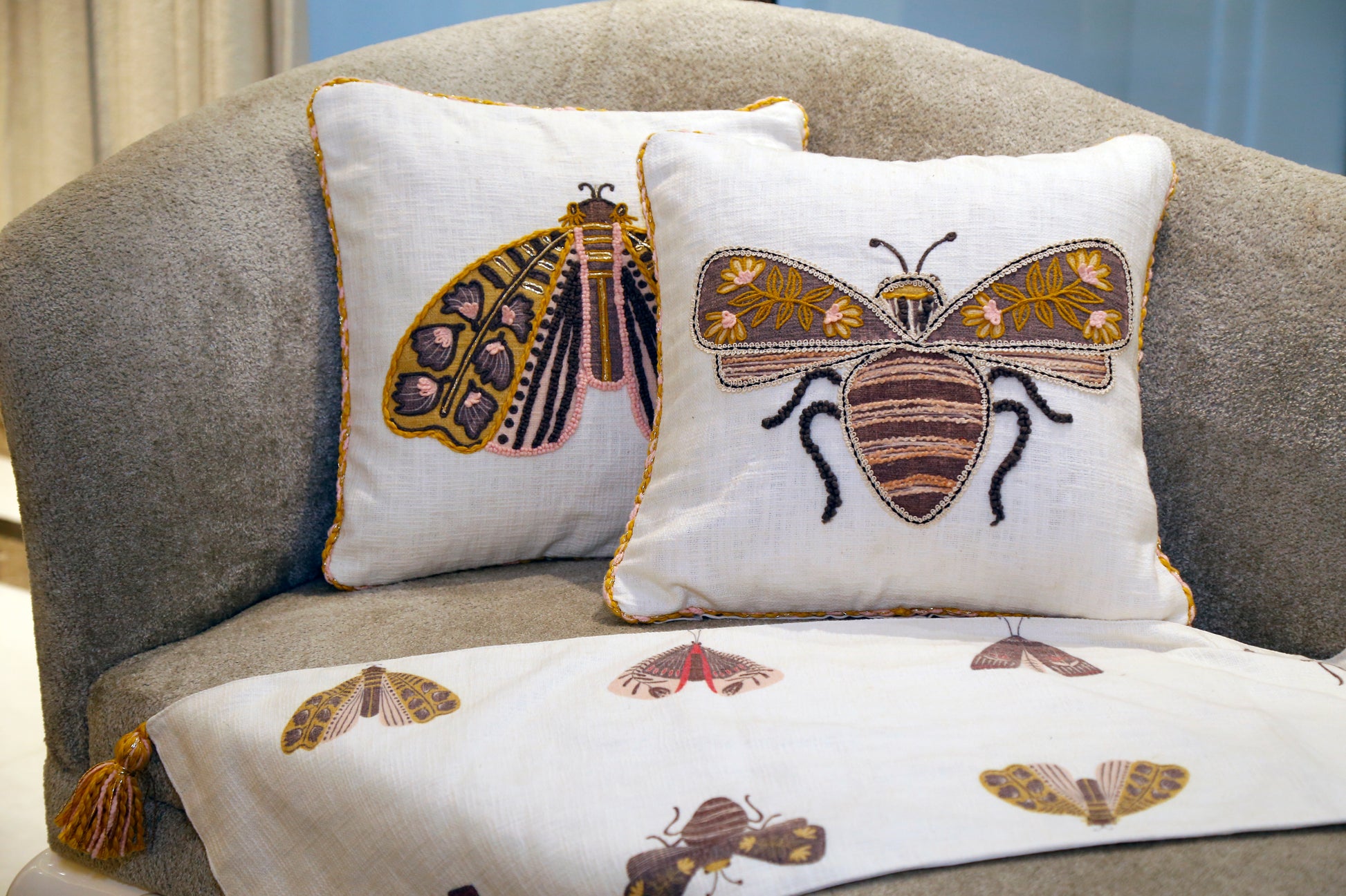 A big and bright Bee , embroidered with Bee,On a textured White base with piping of yarn, as soft as a dove, This pillow is a statement piece, it's beauty, unmatched."