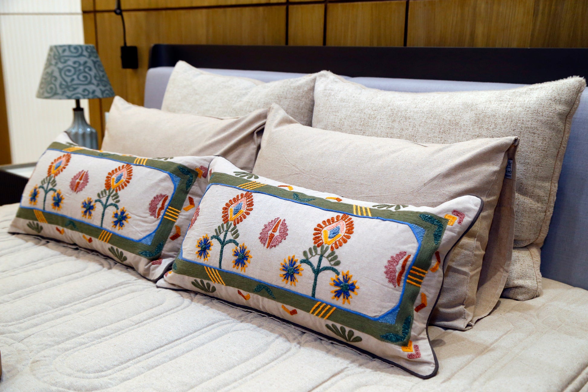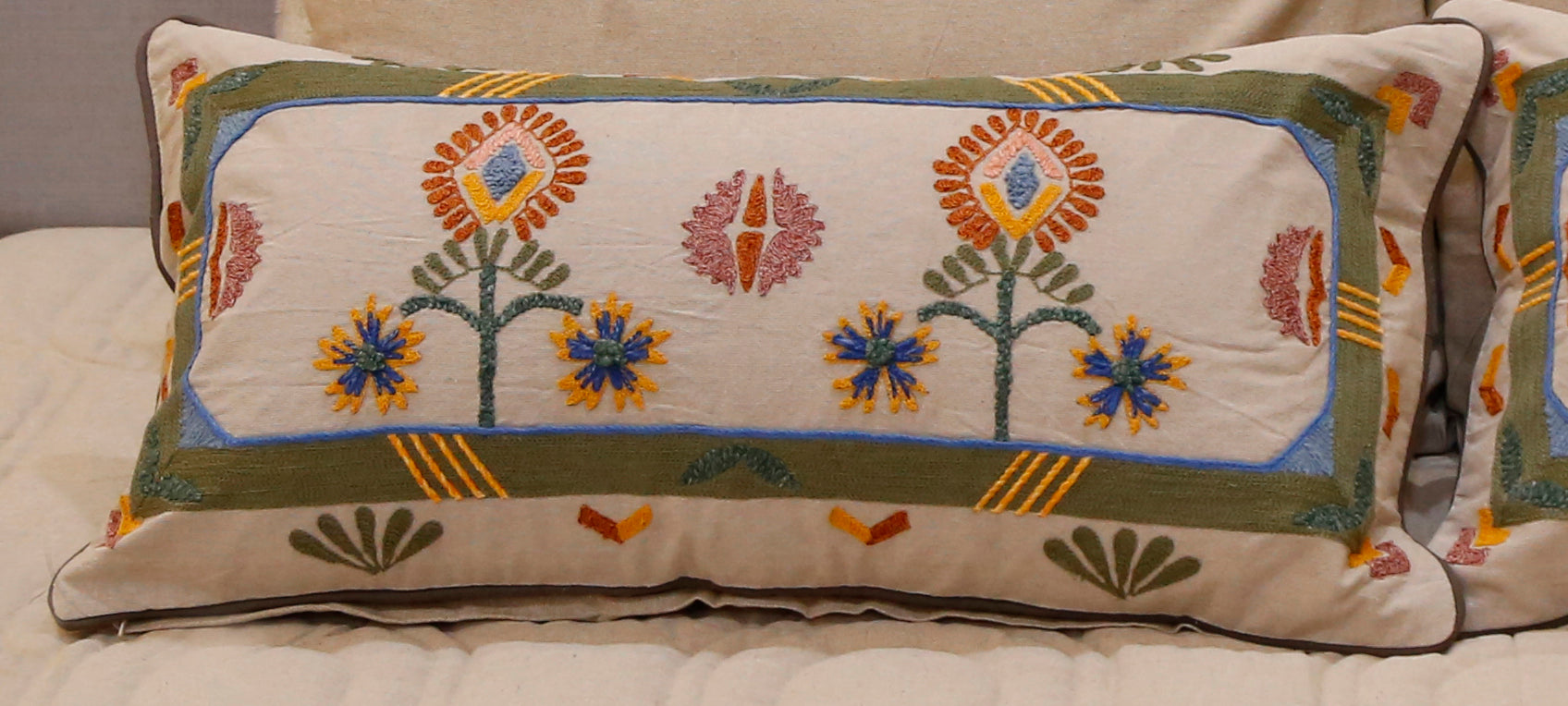 An artisanal cushion adorned with intricate hand embroidery, inspired by blooming floral motifs. A perfect accent piece to bring elegance and character to any space