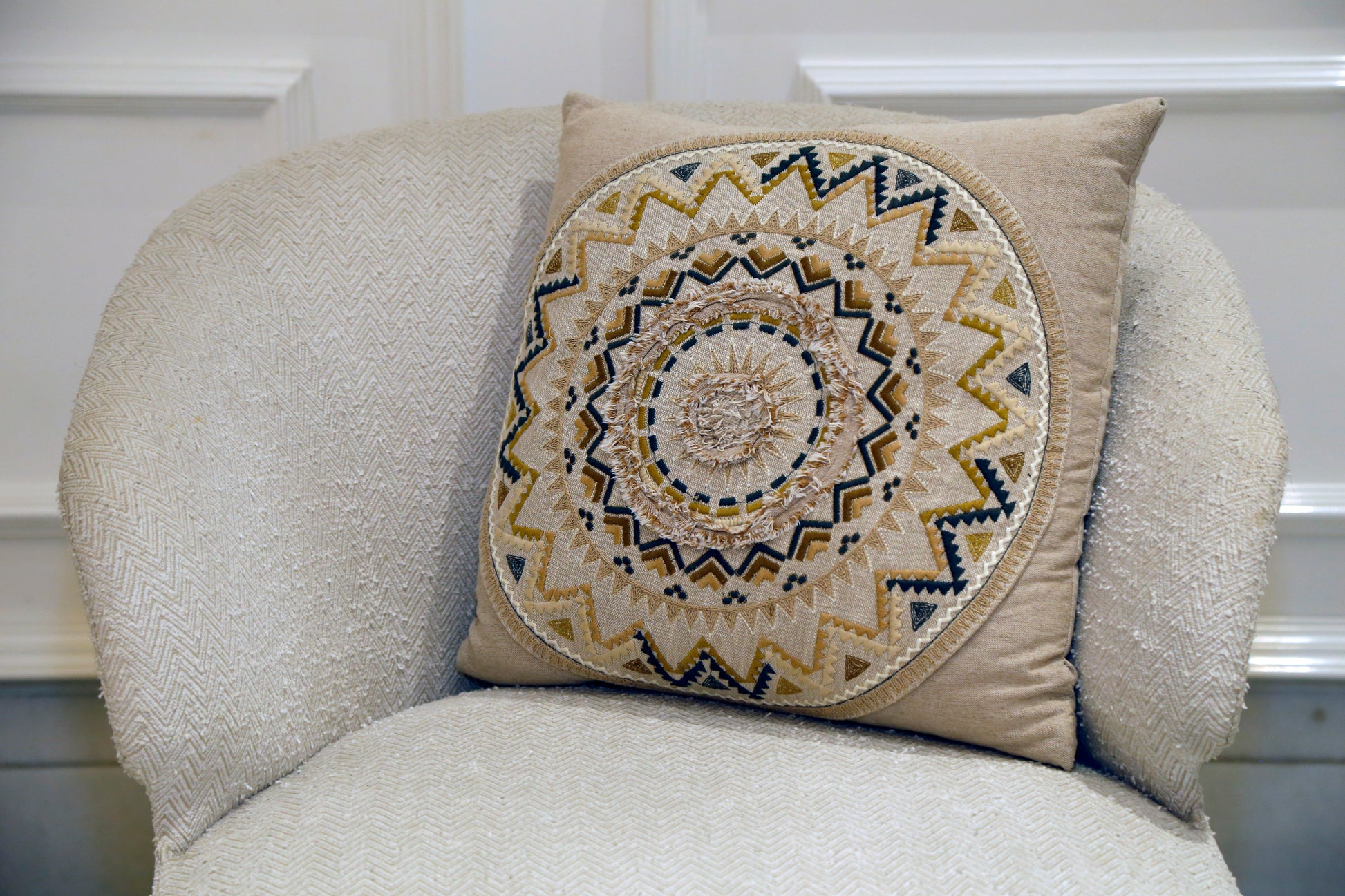 A statement cushion featuring intricate circular embroidery in geometric patterns. Its artisanal detailing adds a bold, contemporary touch to any setting