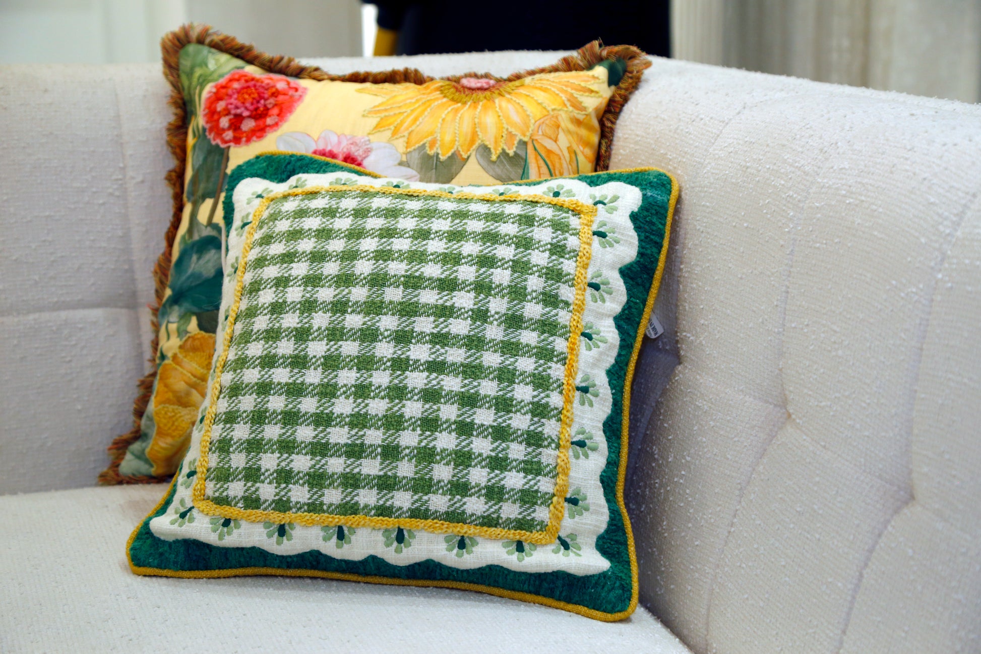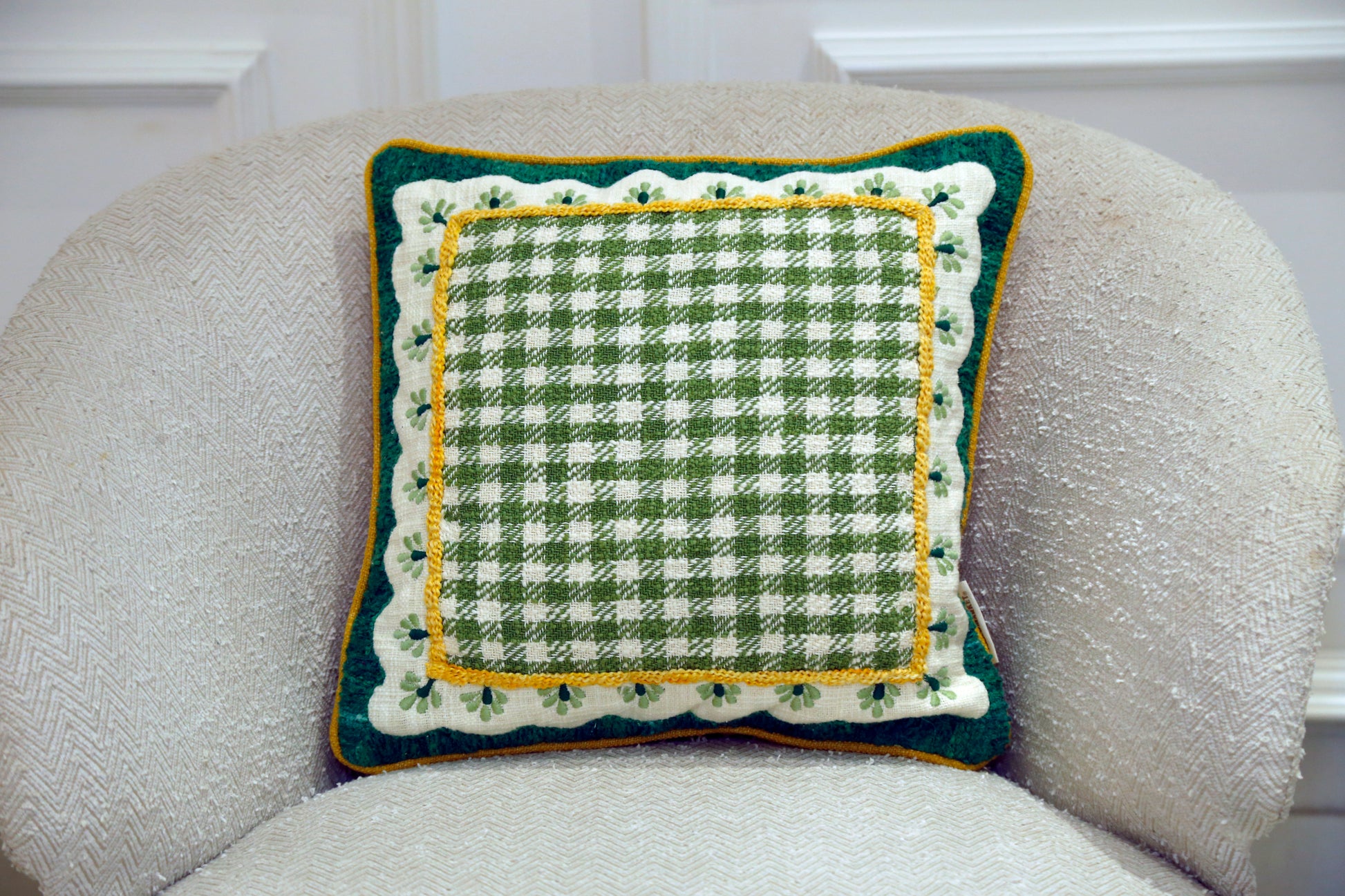 A charming cushion with a woven gingham check framed by embroidered floral details. Its playful yet classic design adds a fresh, cozy touch to any seating space