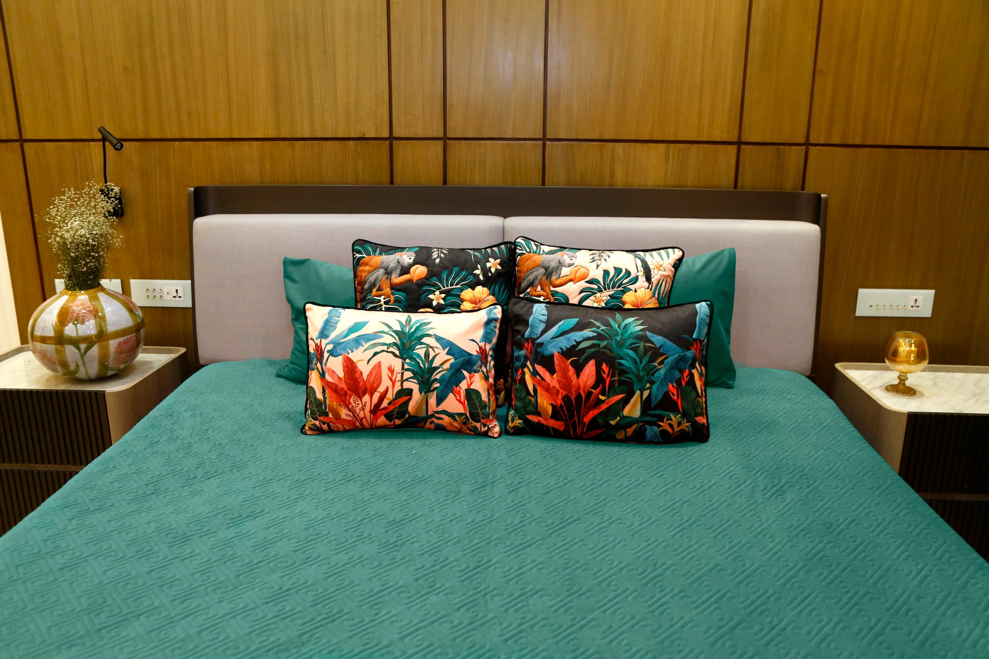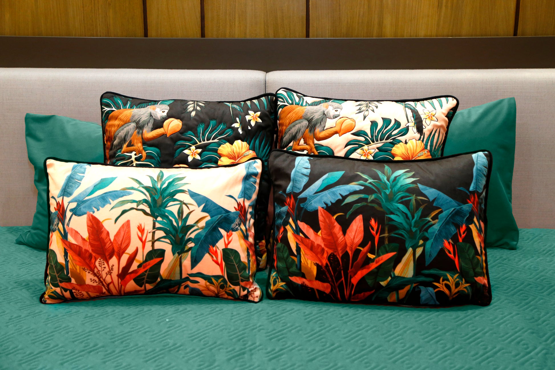 A quilted bedcover paired with tropical-themed cushions featuring lush foliage and playful wildlife. A bold and vibrant set that brings the beauty of nature into your bedroom décor.