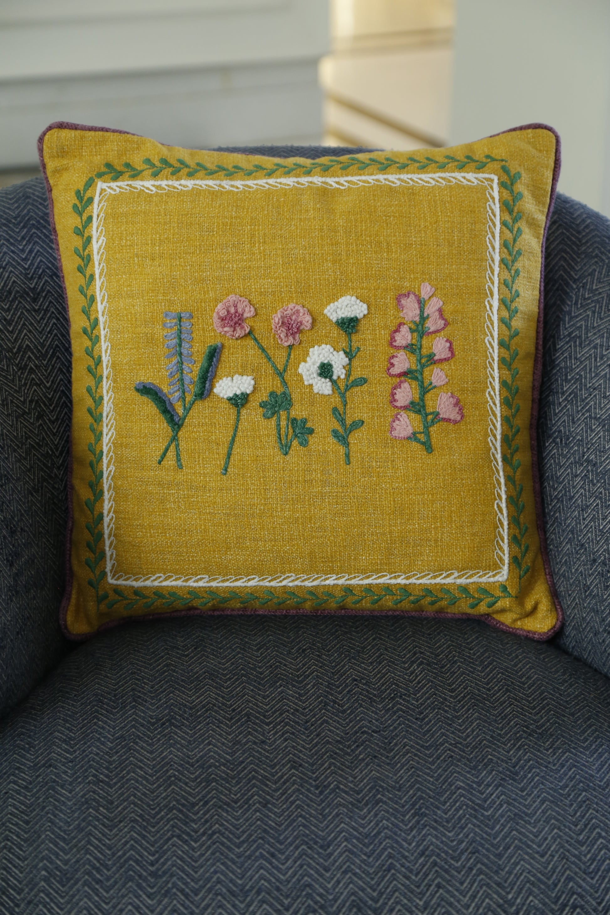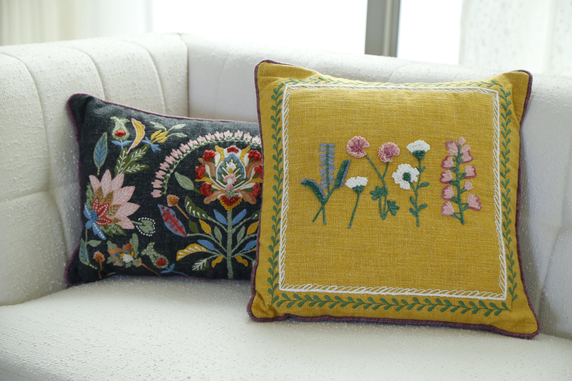 A spring printed cushion with bright color, with hand embroidery so fine, Bringing the feel of new life, so divine, With flowers of rectangle embroidery looking so peaceful, This pillow is a symbol of Spring, a stunning sight