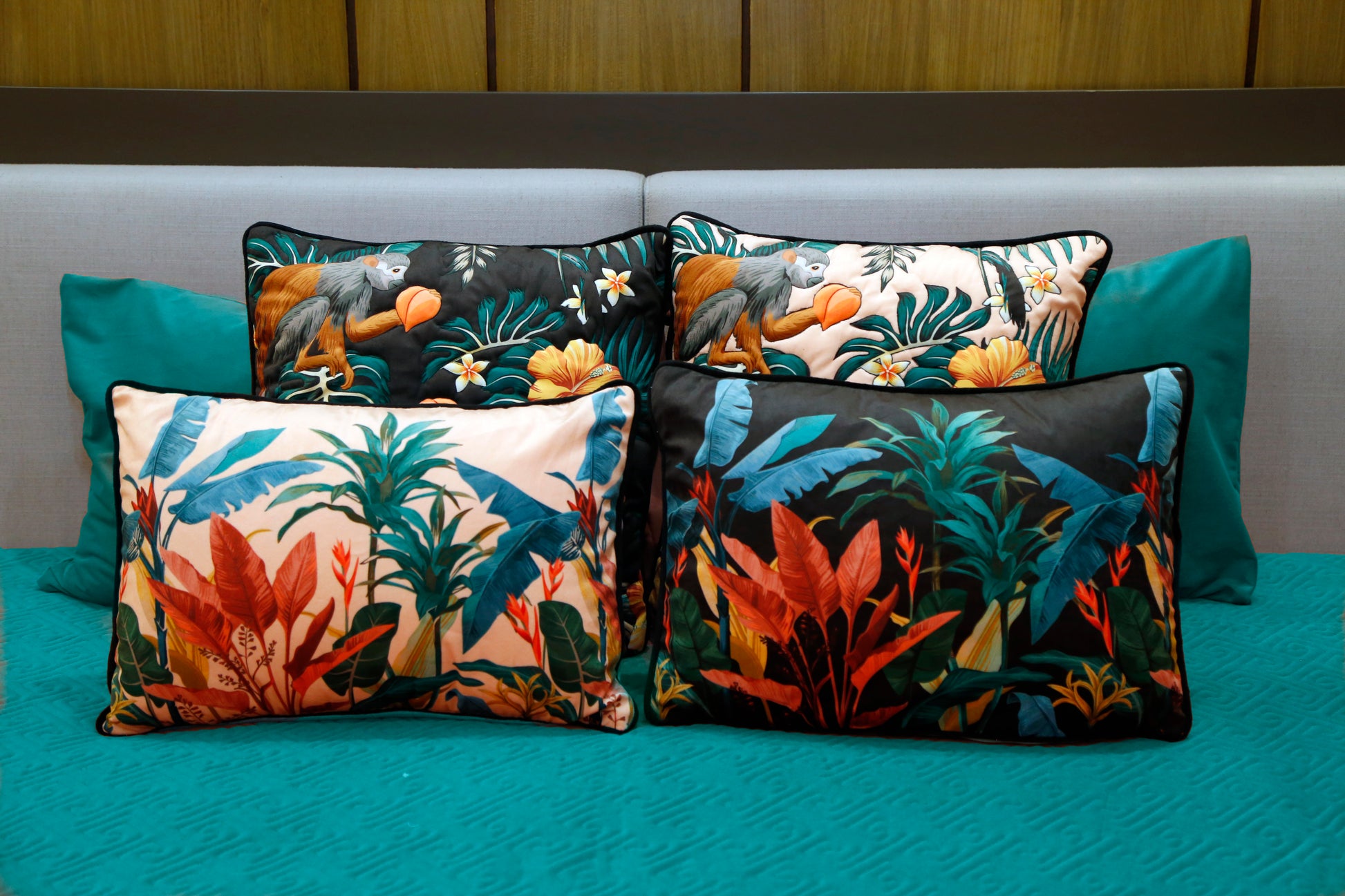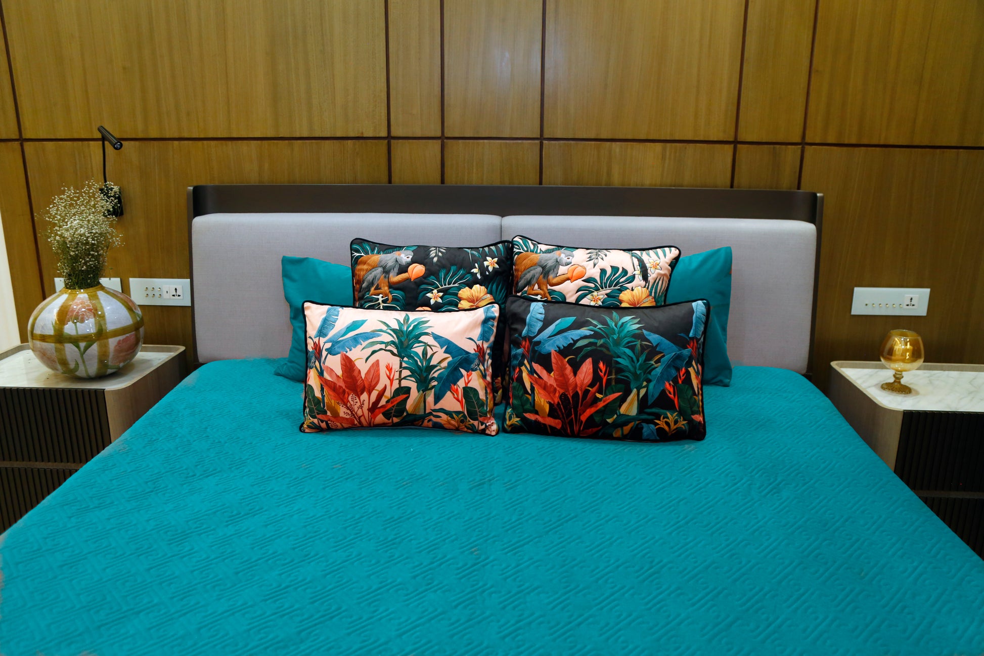 A quilted bedcover styled with vibrant botanical cushions featuring tropical leaves and wildlife accents. This set creates a refreshing, nature-inspired escape right in your bedroom