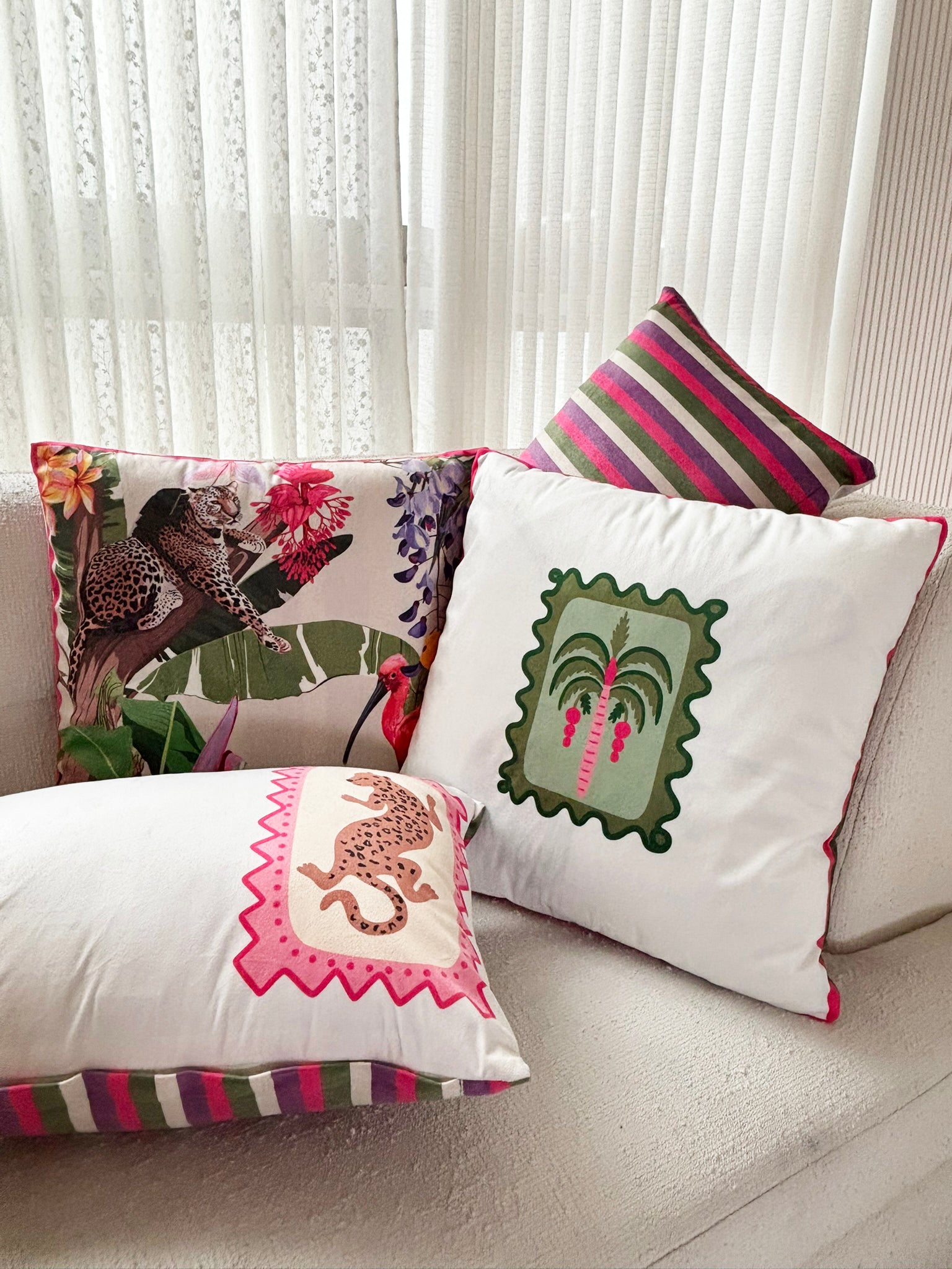 A vibrant cushion featuring playful tropical and wildlife motifs framed in bold, stamp-like borders. Perfect for adding a pop of color and artistic charm to modern living spaces