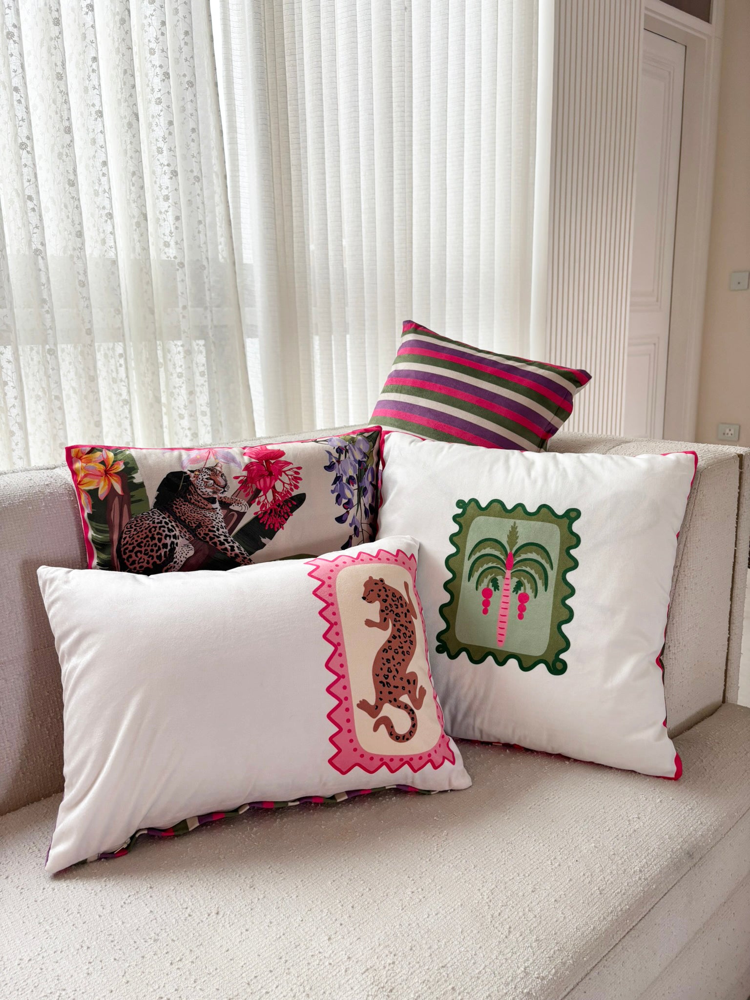 A chic rectangular cushion featuring a bold leopard motif framed in playful pink borders. A perfect accent piece to bring a touch of wild elegance and vibrant charm to any space