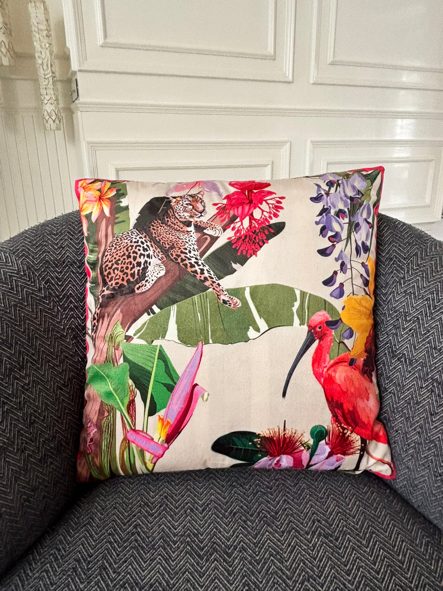 A striking cushion showcasing a jungle-inspired scene with a leopard, tropical blooms, and vibrant birds. Designed to bring exotic charm and a burst of color to your living space