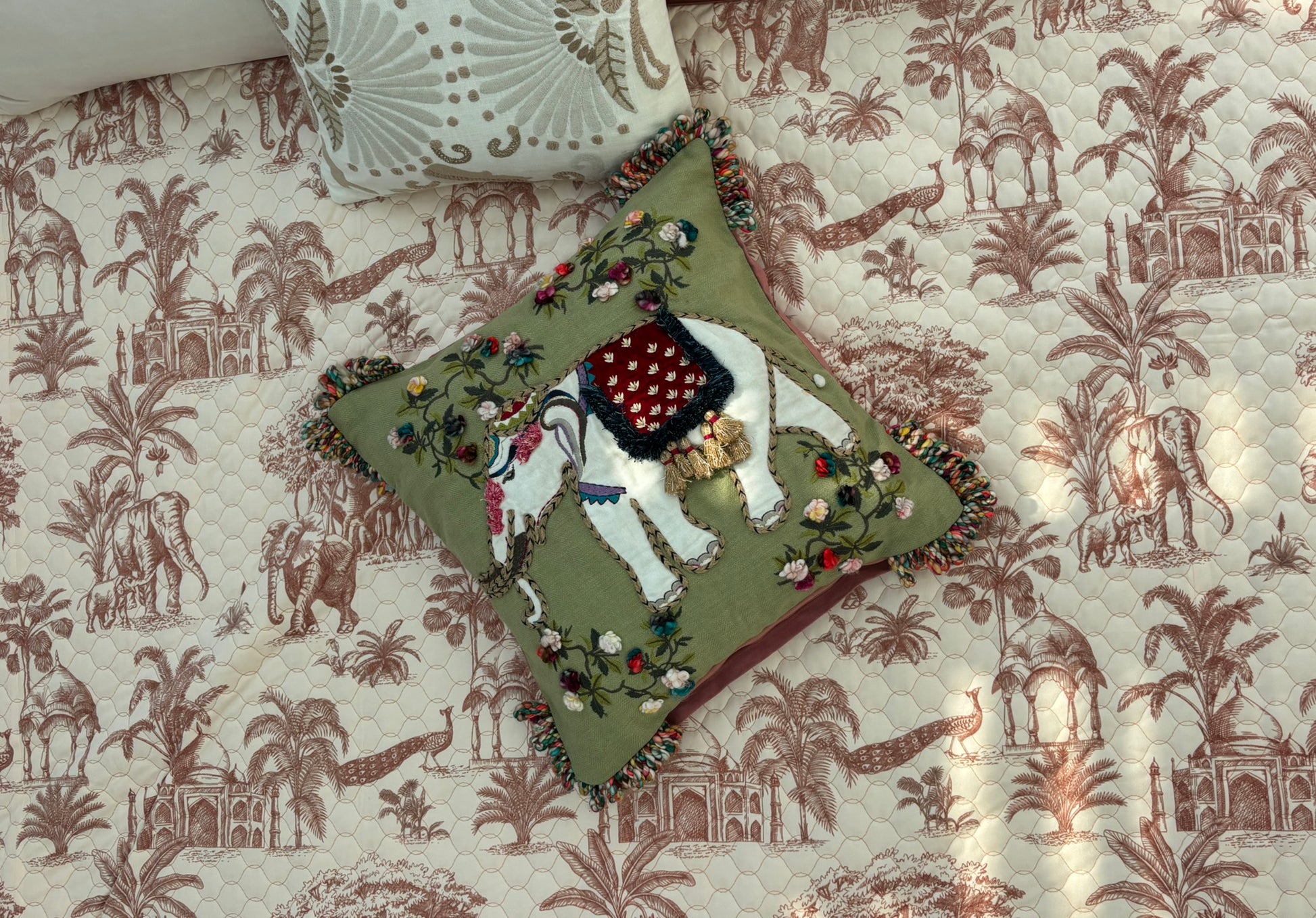 An artisanal cushion featuring a regal embroidered elephant, adorned with floral accents and multicolored braided edges. A charming blend of tradition and craftsmanship, perfect for adding cultural elegance to your home