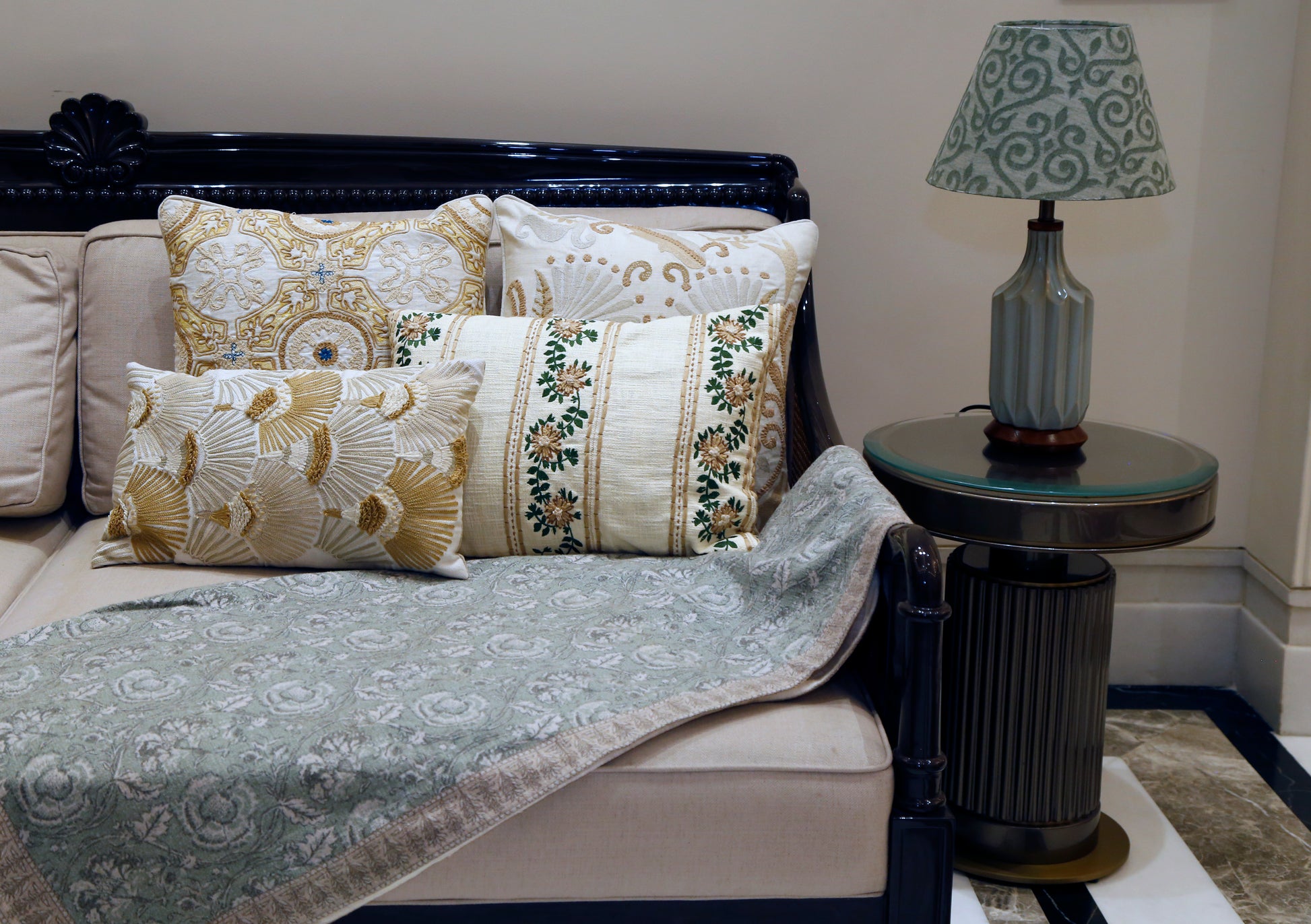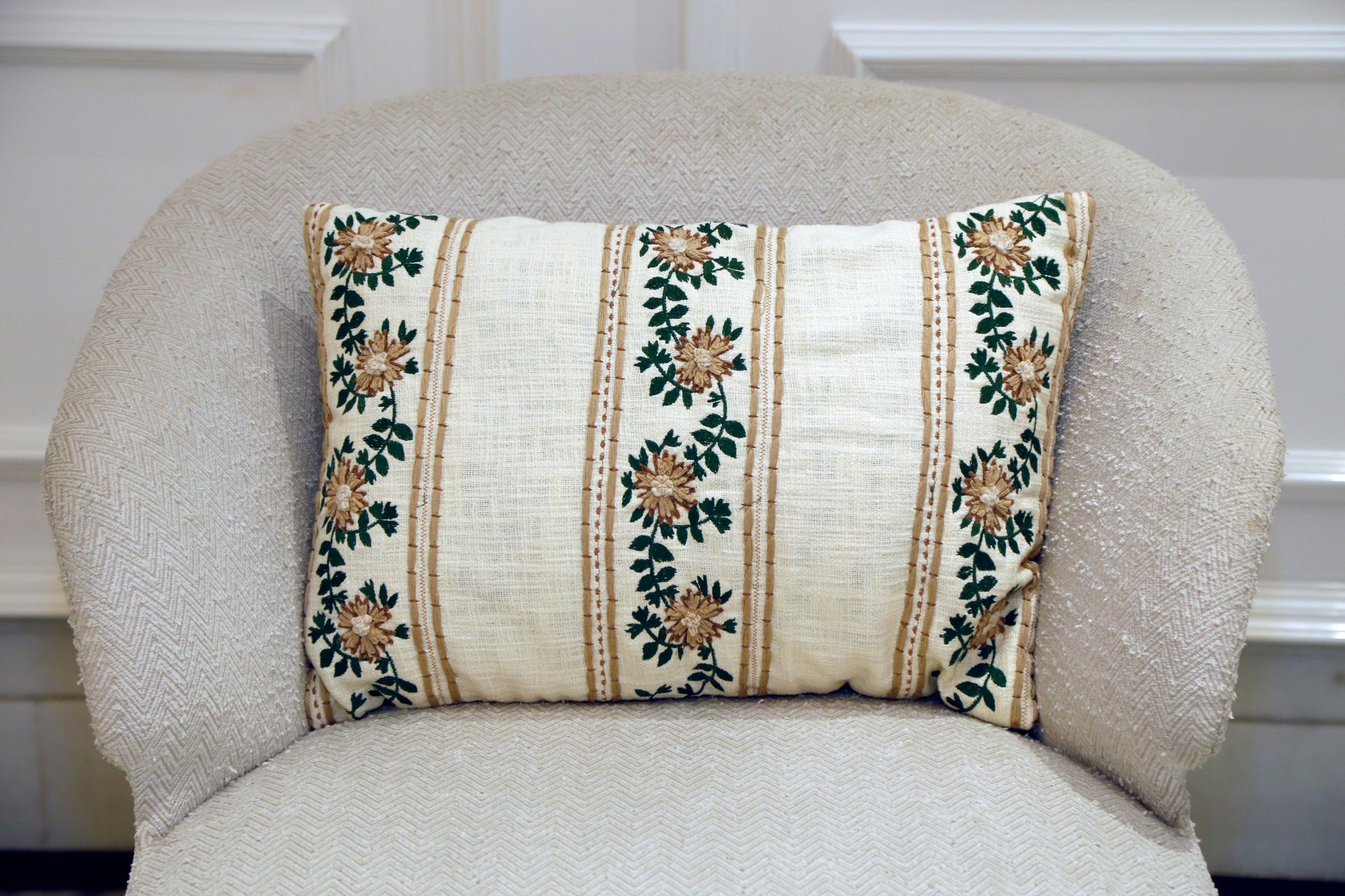 An elegant cushion featuring hand-embroidered floral vines in earthy tones on a textured base. A timeless design that brings natural charm and artisanal detail to your living space