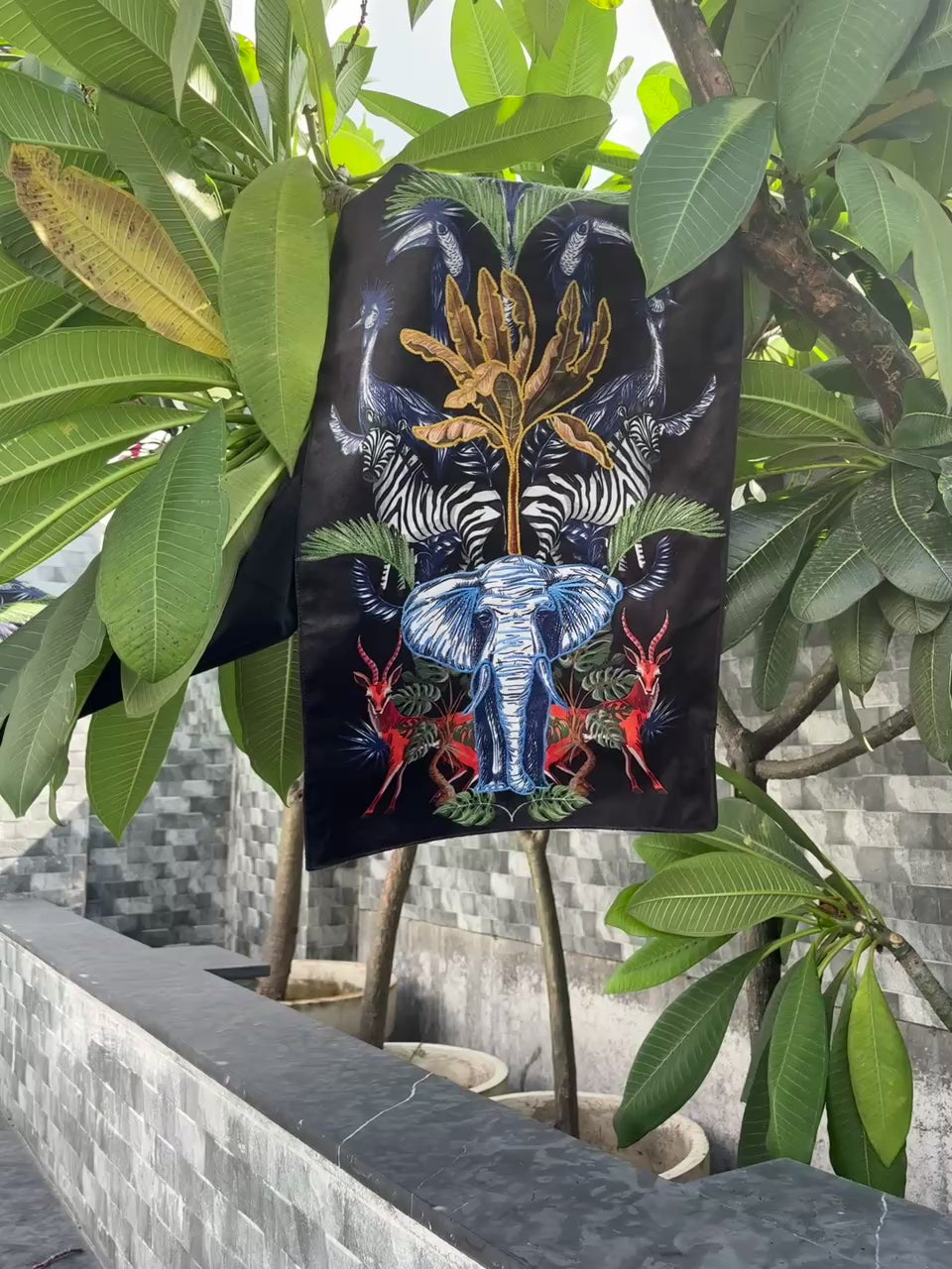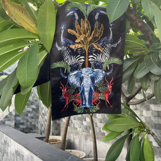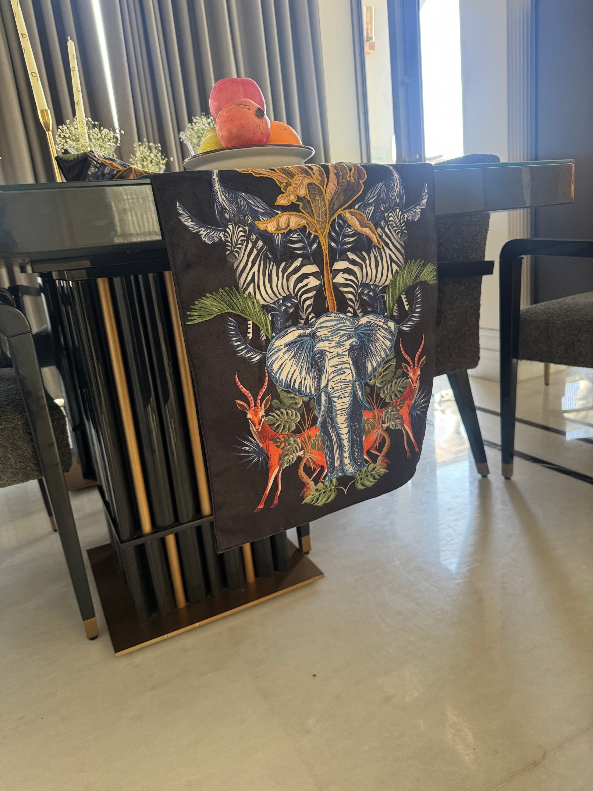 A bold table runner featuring a majestic elephant surrounded by zebras, antelopes, and tropical foliage. Rich in color and detail, it brings a striking safari-inspired elegance to your dining space